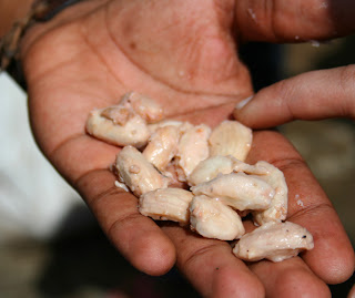 The next process we were shown is how they make a marmalade from cacao. When the pod is cut open and the beans are removed, there is an inner fiberous stem which they call the "heart". The heart is removed and boiled with sugar, it is strained repeatedly. We also got to try the marmalade, again not chocolate-like. Its supposed to be great on cookies or toast.