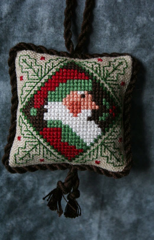I ornamentified these as little pillows stuffed with batting, and trimmed them with cord I made myself, matching the cord with the DMC 3371 that was in every ornament of this set. It tied them all together nicely.
